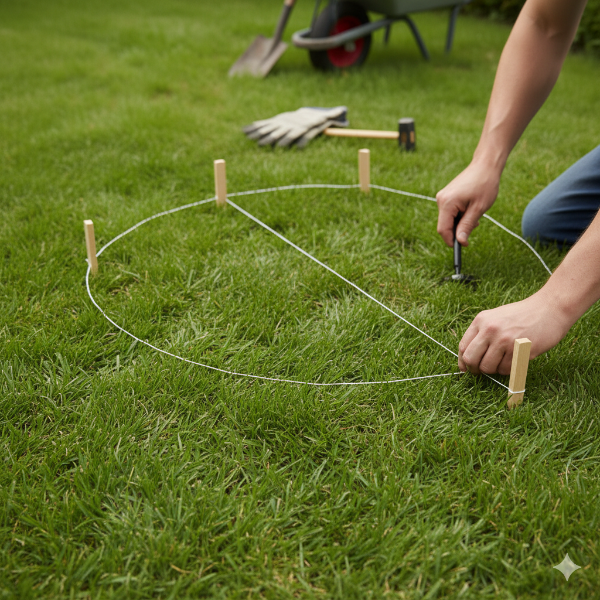 Aan de hand van deze schets zet u het gebied af met paaltjes en touw.
