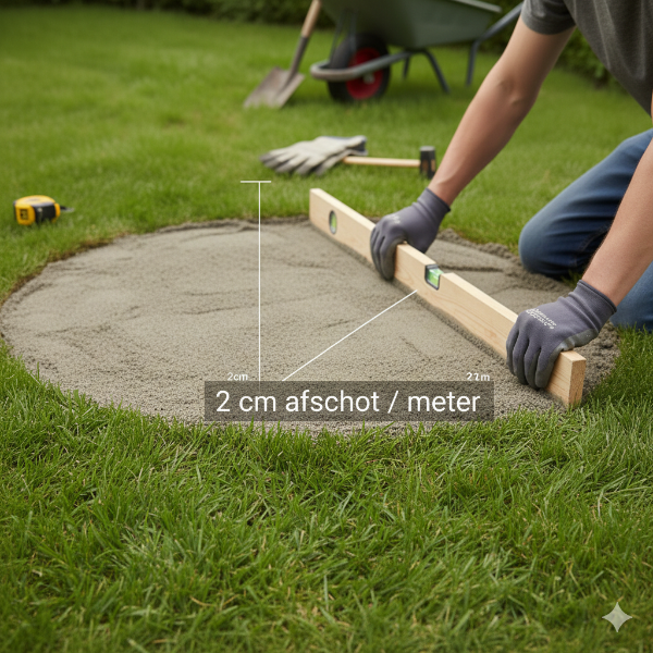 Maak een licht afschot om ervoor te zorgen dat water niet blijft liggen op de bestrating. Houd hierbij rekening met een lichte helling van ongeveer 2 cm per strekkende meter.
