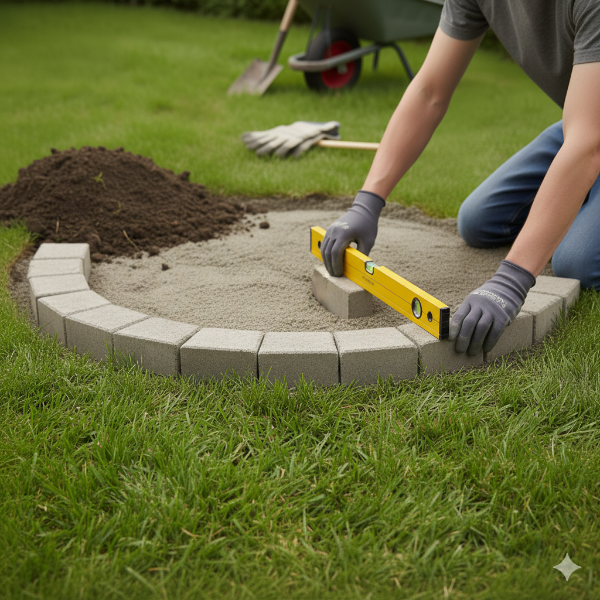 Zet de banden in de sleuf en maak ze waterpas. Controleer met een waterpas en tik ze eventueel aan met een rubberen hamer. Zorg ervoor dat ze stevig in de grond staan.